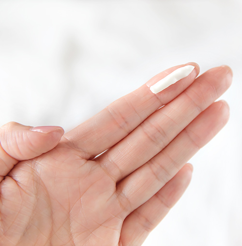 通常は指先から第1関節まで、乾燥がひどい時は第2関節まで。少し多いと思うくらいの量を、惜しみなくつけましょう。もし、多く出しすぎた時には手首からひじにかけてのばして。先に顔用のローションなどで水分補給をすると手肌になじませやすくなります。