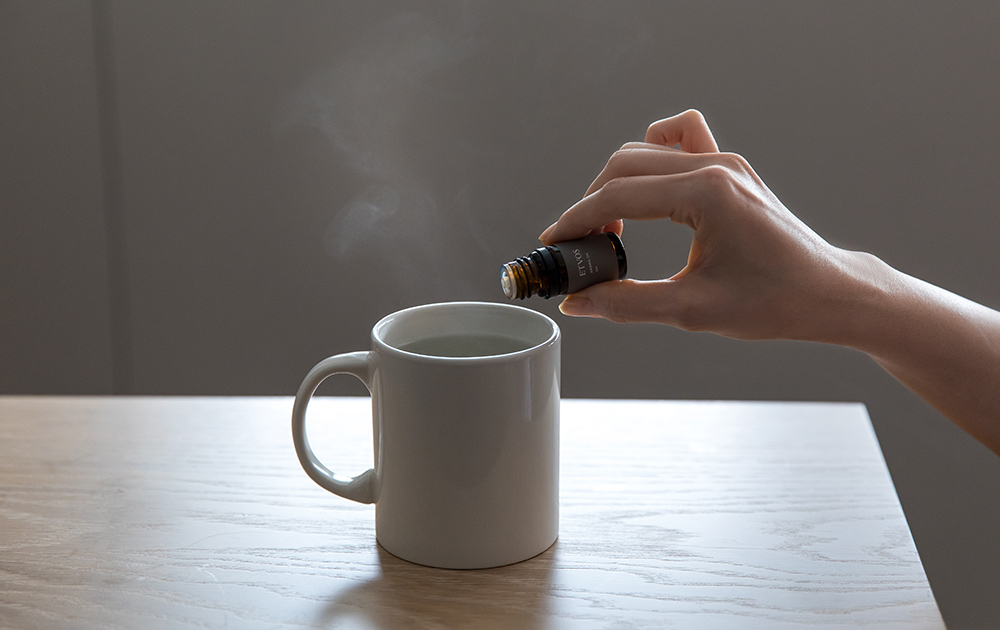 お湯の入ったマグカップなどの耐熱容器に、1~2滴垂らして鼻先に持っていくと、湯気とともにアロマが漂い、即席アロマディフューザーの出来上がり。オフィスで行えば、ディフューザーの代わりになるだけでなく、加湿効果も狙えます。