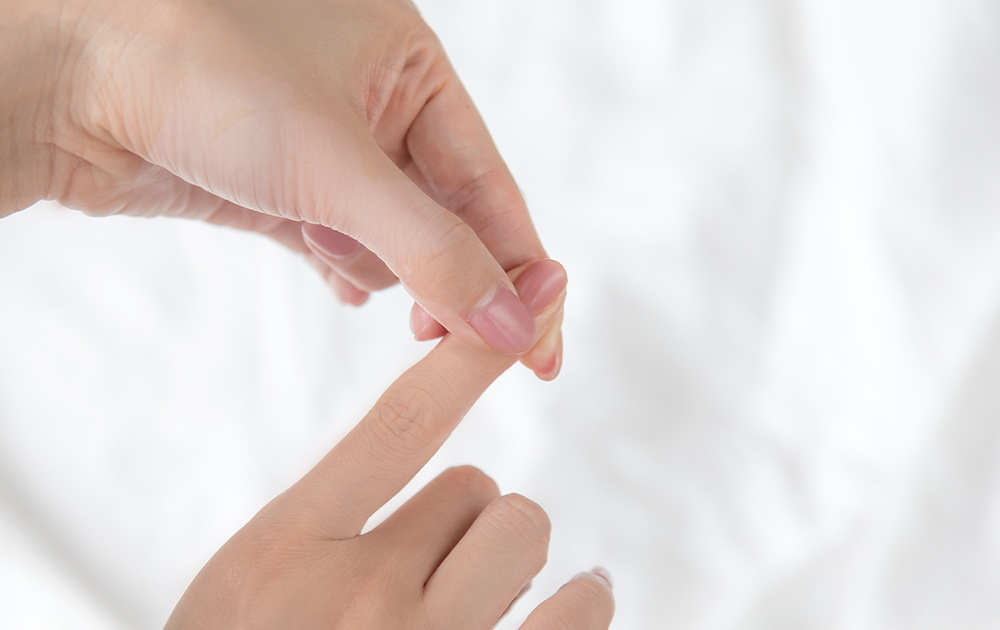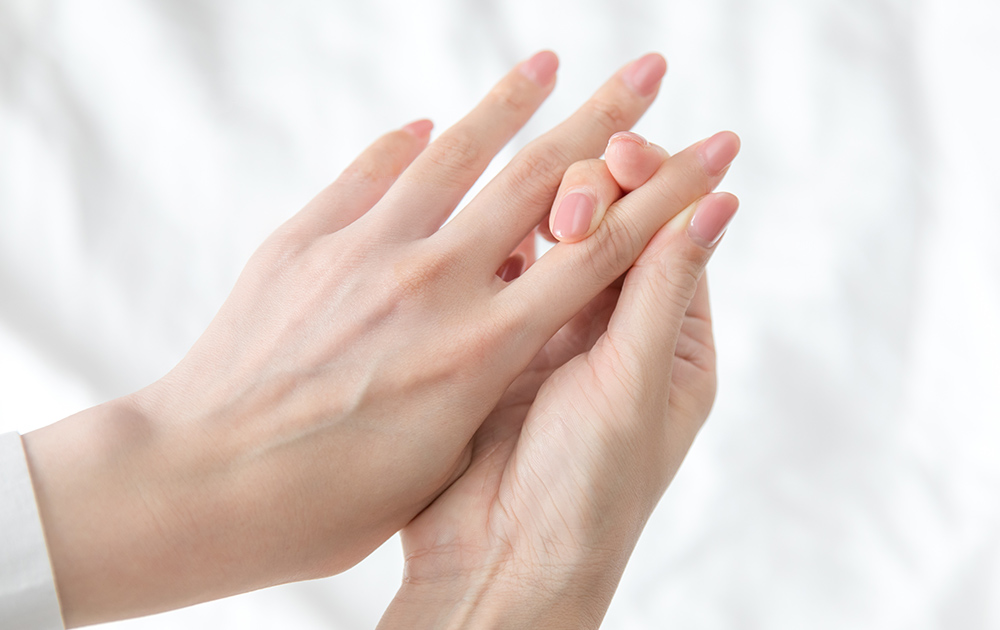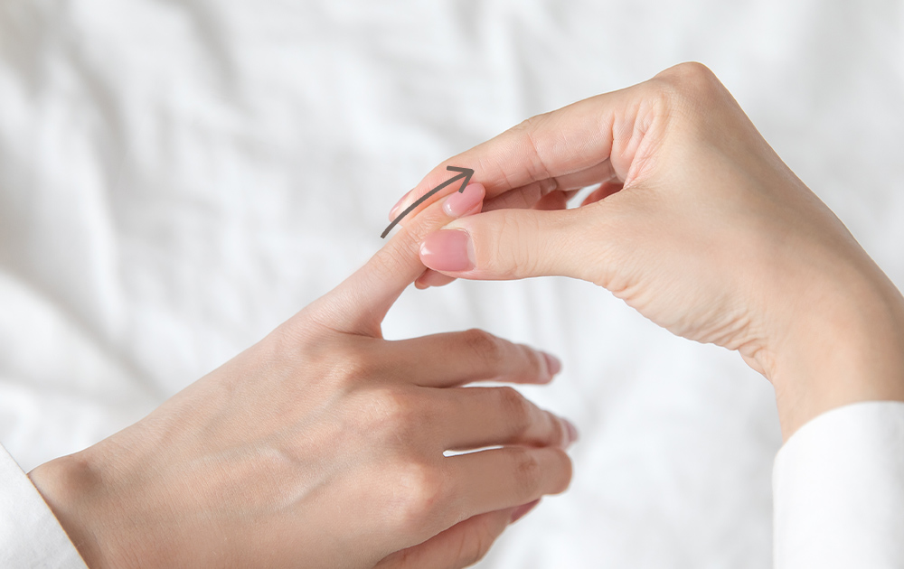 5本の指先を順番に刺激します。(指先を)つまんだり、引っ張ったり、爪部分をもんだりすると、マッサージによるリラックス効果が得られます。