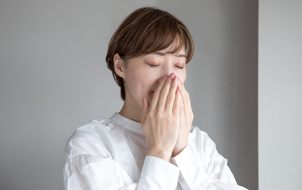 鼻を手のひらで覆うようにしながら、ゆっくりと深呼吸します。フレッシュハーバルの香りが漂い、リラックスした気分に。できれば、水仕事をしたり手を洗ったりしたら、その都度行う習慣を身につけて。
