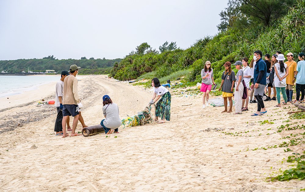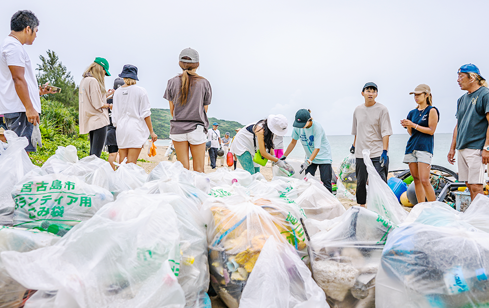 ティシュキン:クリーン活動当日は朝からあいにくの雨。ところが、ビーチのゴミを拾い始めた途端、雨が止むという奇跡が起こりました。今回は、スペインのサステナブル素材のファッションブランド「エコアルフ」さんとのコラボ活動。エコアルフストアのひとつが宮古島にあることからスタッフのみなさんや、宮古島市役所のエコアイランド推進課の職員の方、宮古島の住人のみなさんもご参加くださり、総勢約40名で海岸のゴミ拾いをしました。