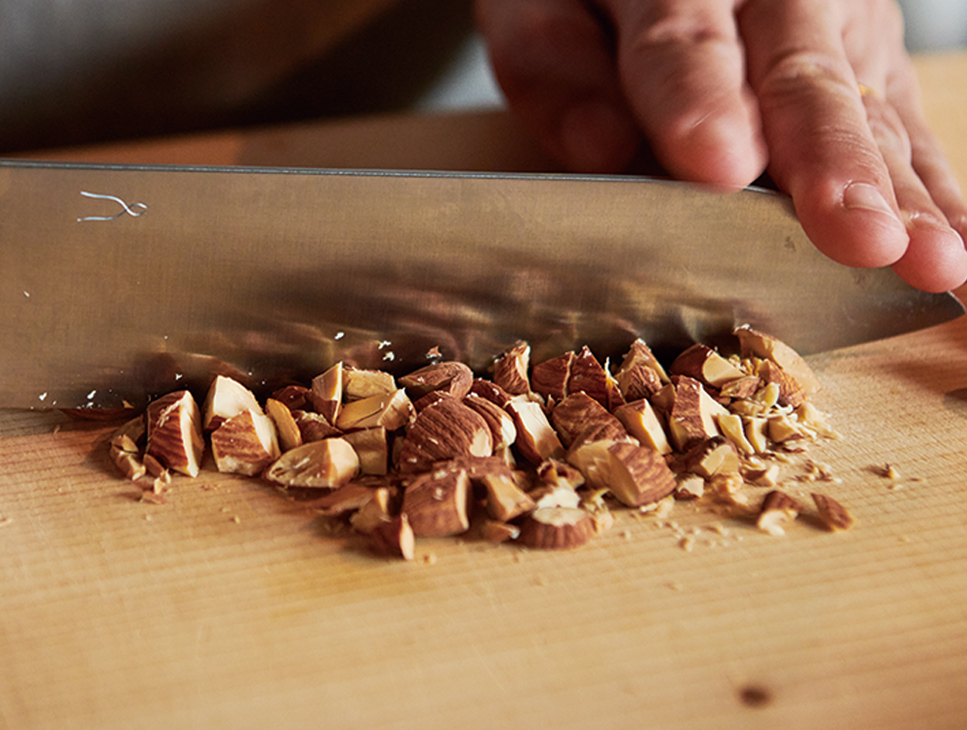 2 ローストアーモンドを刻むローストアーモンドを粗く刻む。(生アーモンドの場合はオーブン160〜170℃で10~12分ほど焼いてから刻む。)