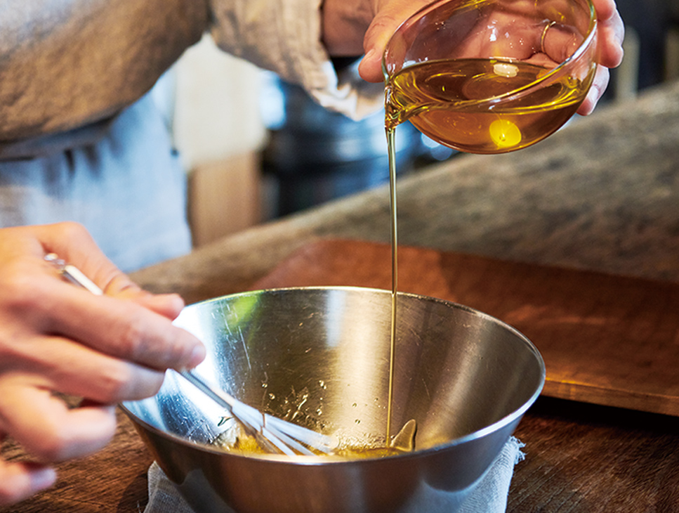 3 マリネ液をつくるボウルにレモン果汁とはちみつを混ぜ合わせ、さらにオリーブオイルを少しずつ加え混ぜ、塩で味を整える。