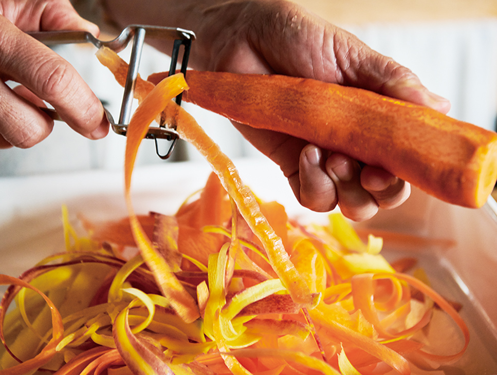 4 にんじんをスライスするにんじんは土の汚れなどを丁寧に洗い、ピーラーを使い薄くスライスする。