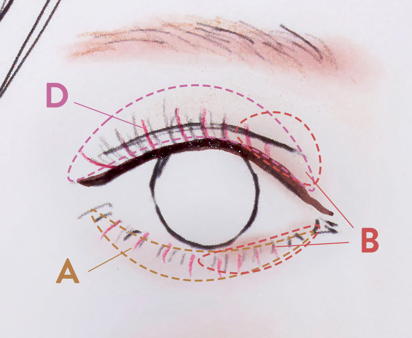 1. Dを上まぶた全体に広くのせる。その上からBを目頭側2/3に丸く重ねて。