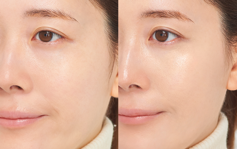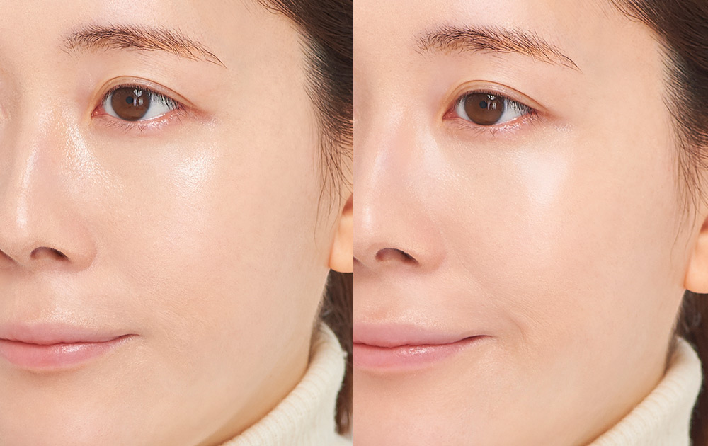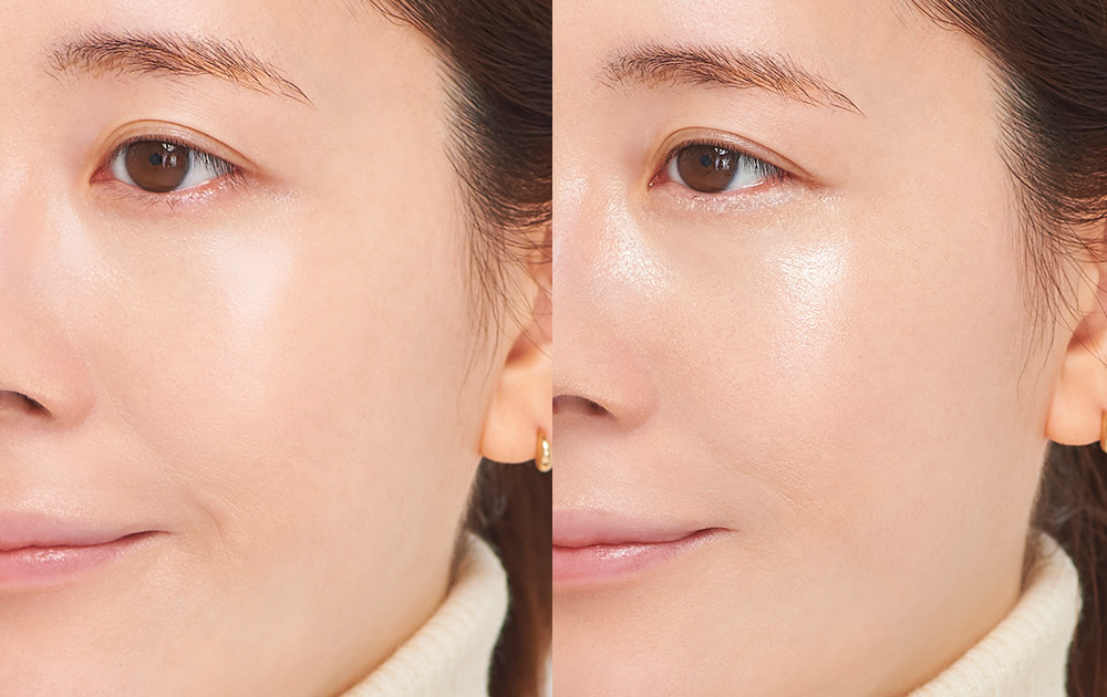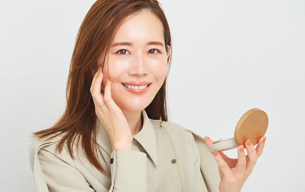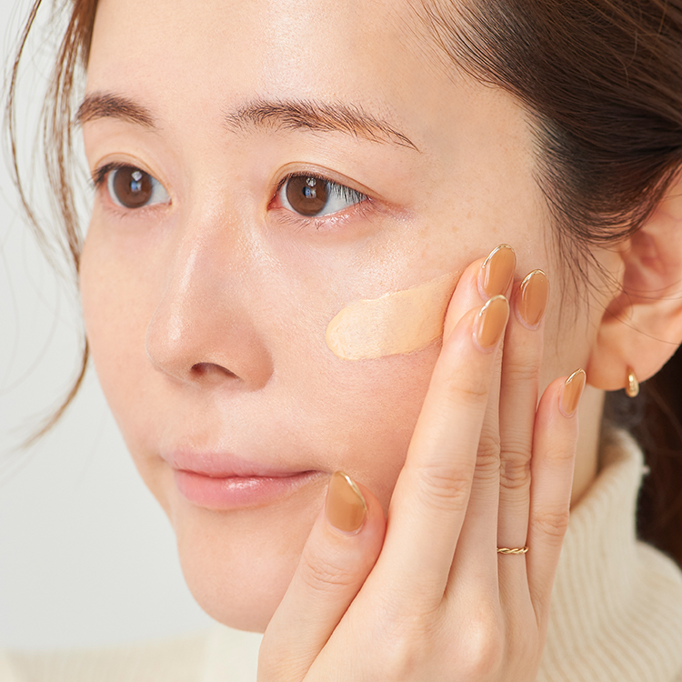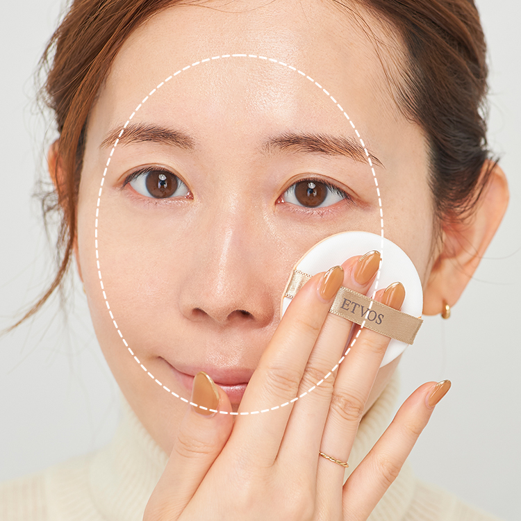 まず、ベースで肌トーンを均一にしてから、クッションファンデをフェイスラインの内側だけのせます。さらに、頬の三角ゾーンなどに重ねることで、メリハリのツヤを感じさせる“大人キレイ”な肌に仕上がります。デイリー使いにもおすすめです。