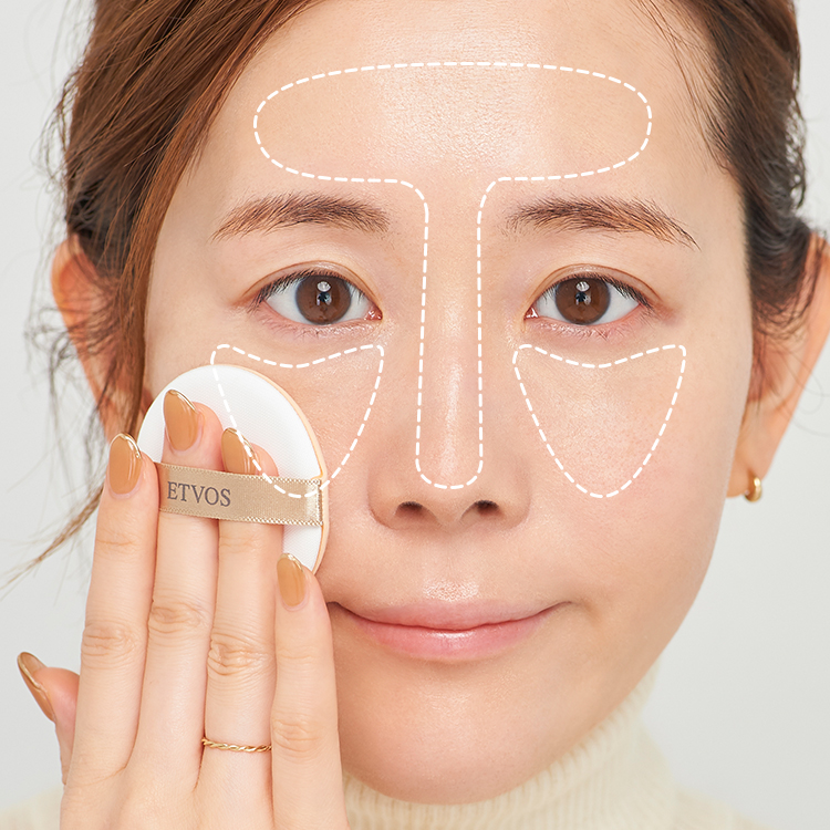 2.さらに、頰の三角ゾーンやTゾーンに重ねて、“追いツヤ”すれば、メリハリの効いた顔立ちに。