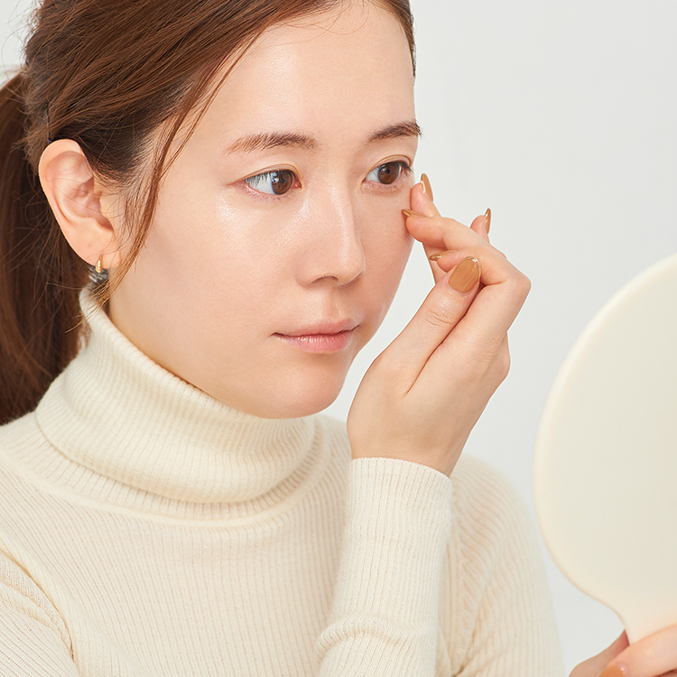 3.薬指でファンデーションを塗った所と塗ってない所の境目や、目元周り、小鼻周り、口元などを軽くなじませます。このひと手間で、体温と混ざり合ってリアルなツヤを感じさせる美肌を演出できます。