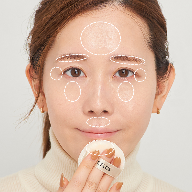 2.額の中央や目の間の鼻筋、唇の上、あご先などちょっと高く見せたい部分にパウダーを重ねます。また、黒目の下部分の頬や眉、目の際なども薄く重ねると時間が経った後もキレイをキープできます。