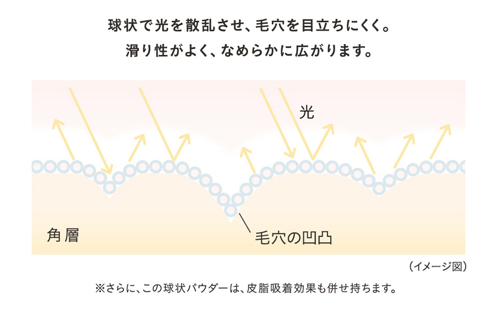 これによりすべりがよくなり、光の散乱効果も発揮して、毛穴の凹凸をふんわりぼかすことができます。