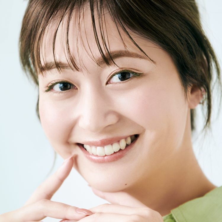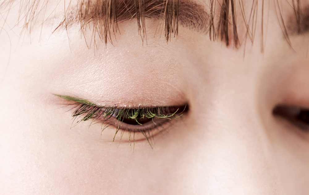 グリーンのアクセントが映えるよう、まぶたには血色カラーを薄くのせるだけ。洒落感のあるやさしげな目もとに。