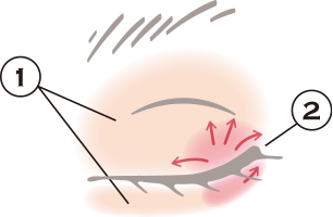 ②Dをチップに取り、上下の目尻側にのせ、矢印の方向に指でぼかす。