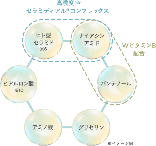 角層にうるおいを繋ぎとめるために厳選した高濃度※9セラミディアル®コンプレックス※8と、ナツメ果実エキス※7による独自の濃密うるおい処方。