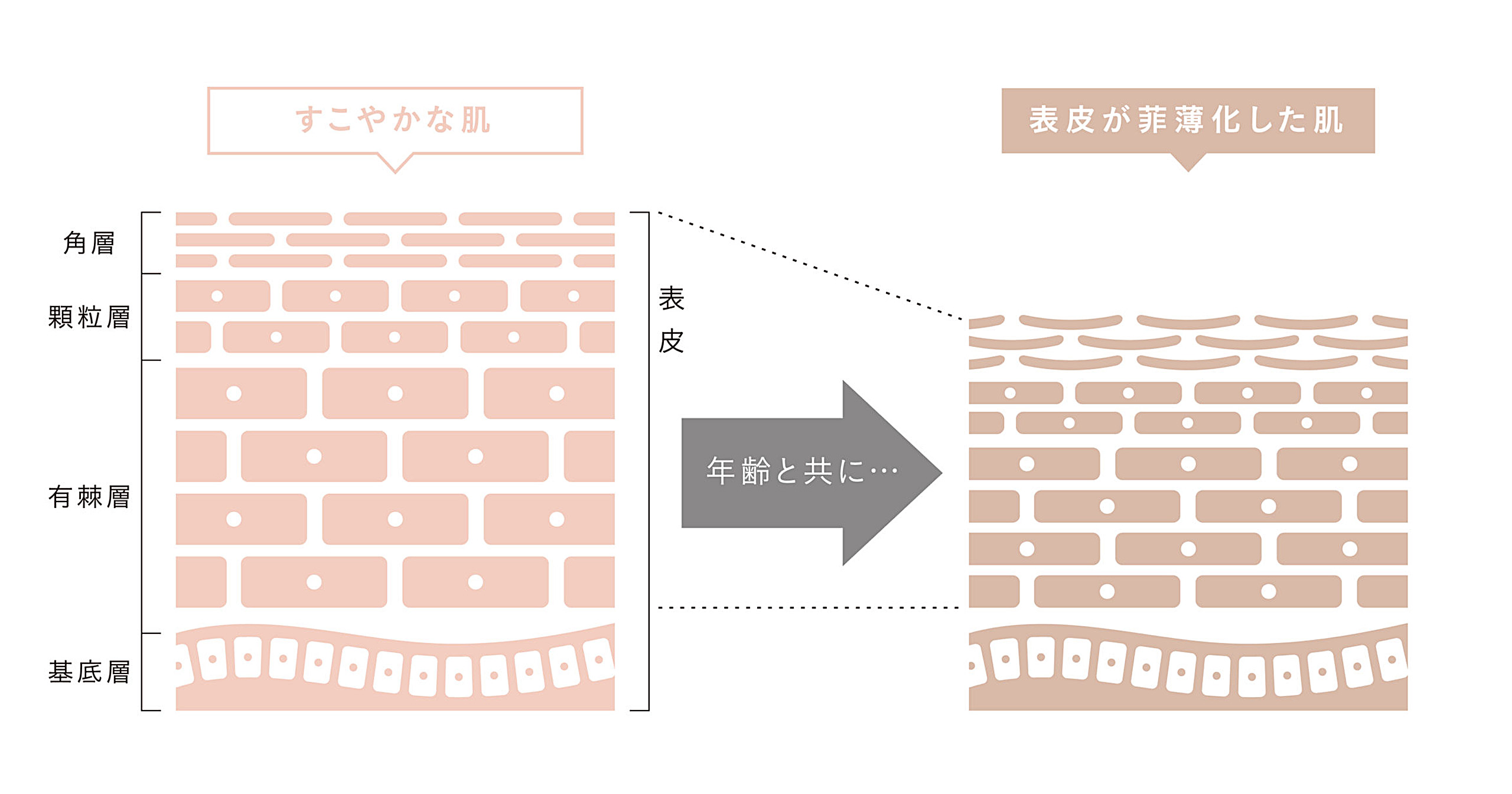 年齢を重ねるにつれて、肌全体の厚みは薄くなってしまいます。 左の健康な肌は、表皮の肌サイクルが健全で角層も整った状態で、厚みがしっかり保たれています。 一方、右の菲薄化が進んだ肌は、表皮の肌サイクルが乱れ、肌が薄くやせています。 このように、加齢により表皮が薄くなることで、うるおいを蓄えにくくなります。 まさに、ベッドのスプリングがへたってしまった状態のように、疲れた顔印象に見えてしまうのです。