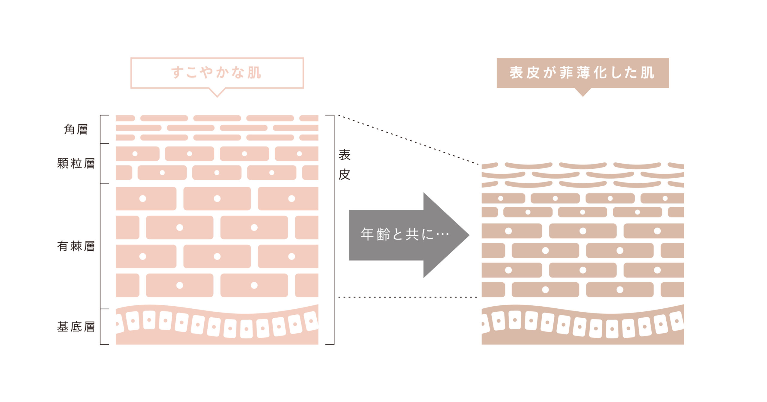 一方、右の菲薄化が進んだ肌は、表皮の肌サイクルが乱れ、肌が薄くやせています。