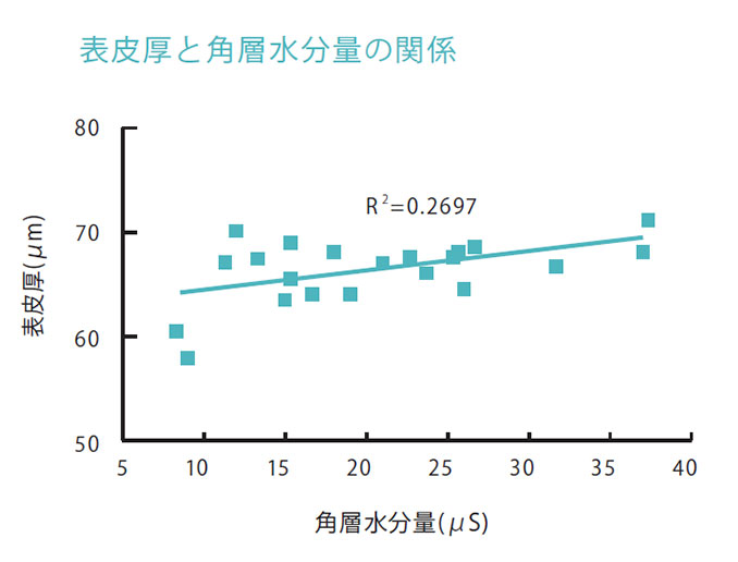 上のグラフでは、加齢と共に表皮の厚みが下がってくることがわかり、下のグラフでは、表皮の厚みが下がると角層の水分量も下がる(=乾燥する)ことがわかります。