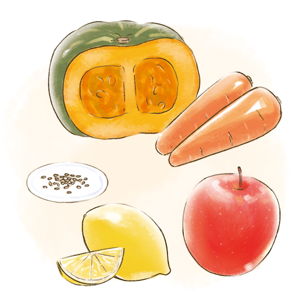 ストレスや紫外線、不規則な生活などで発生する活性酸素は、ターンオーバーの乱れの原因になることも。抗酸化作用が強いといわれるビタミンA・C・Eを含む食材を積極的に摂取するのがおすすめ。ビタミンAはかぼちゃやにんじんなど、ビタミンCは葉物野菜や果物、ビタミンEはアボカドやごまなどに含まれているので、毎食食べたいものです。