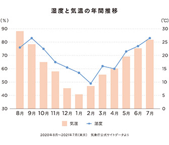 グラフからもわかるように、11月〜1月まで、急激に気温も湿度も下がります。 しかも湿度においては、11月以降70%を切る状態に。室内では、さらに暖房によって湿度が30〜40%まで下がってしまいます。これでは、肌からうるおいが蒸発して、外気から肌を守るバリア機能も低下してしまいます。