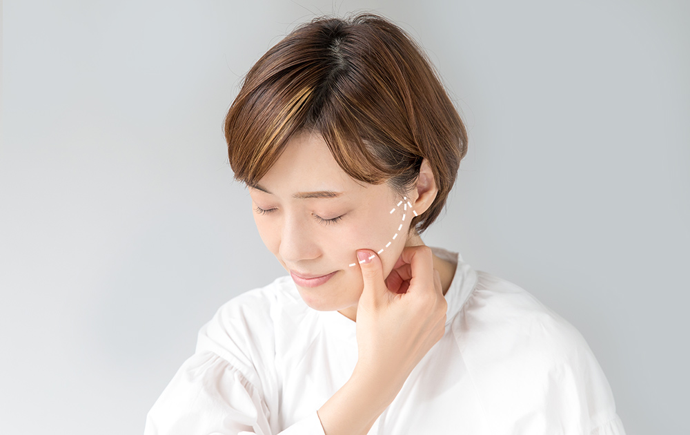 頰の筋肉の下部分に親指の腹を当て、ひじをテーブルの上に置いて頭をもたげます。少しずつずらしながら大&小頬骨筋を刺激すれば顔全体のリフトアップに。