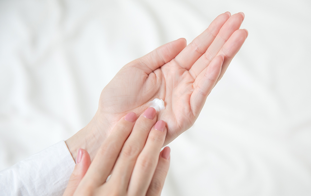 クリームを1~2プッシュ手のひらに取り、両手を合わせながら体温で温めてやわらかくします。