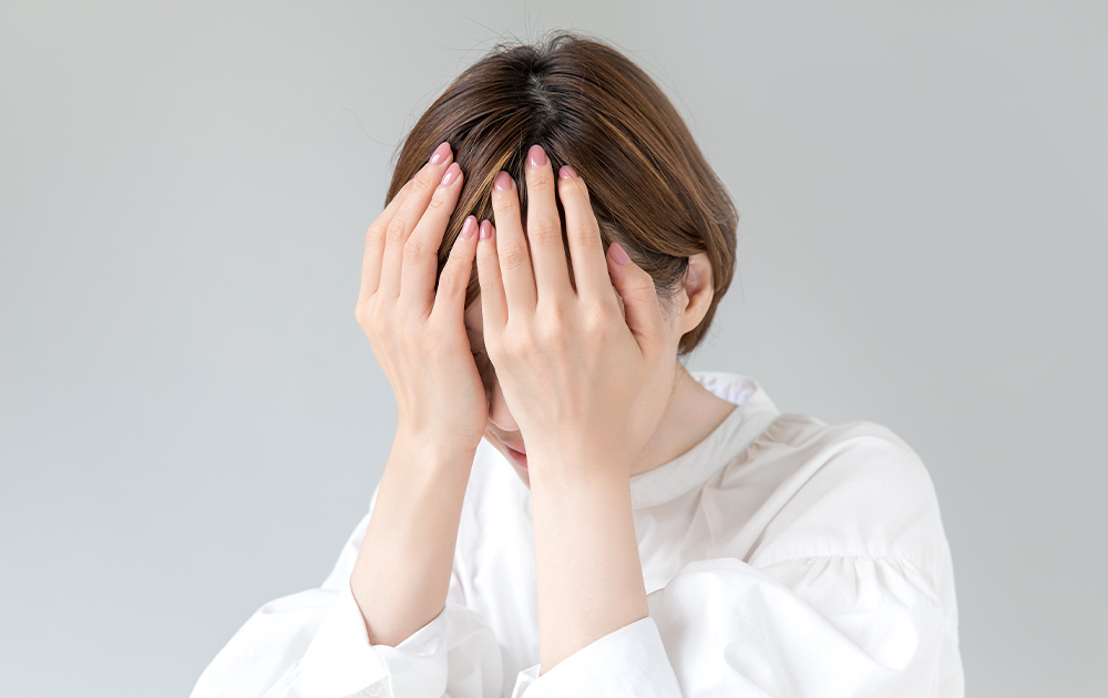 テーブルの上にひじを置き、手根部分(手のひらの下部、ふくらみのある部分)を目元に軽く当てながら頭の重みをかけます。この時に深呼吸を3回して、ゆっくりハンドプレスを。