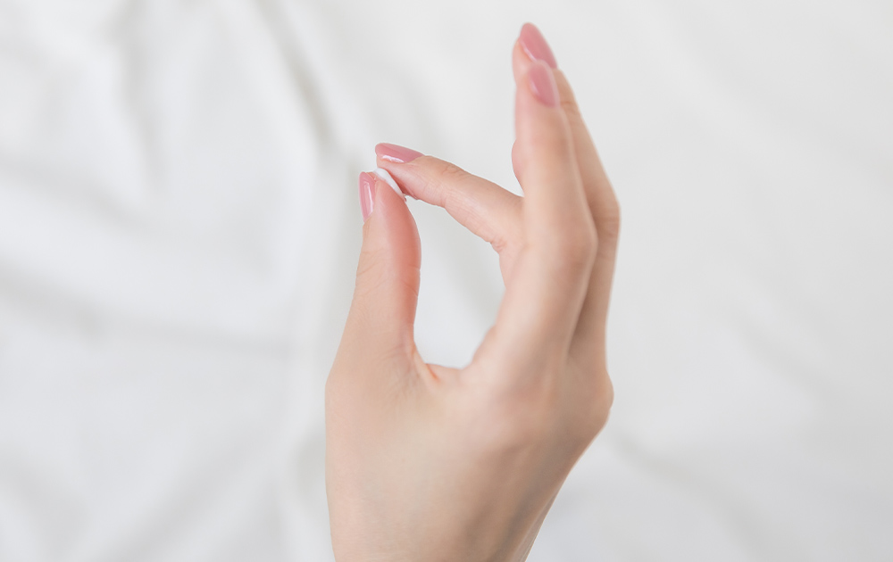 薬指に1プッシュを取り、親指の腹を合わせながら温めてやわらかくしておきます。