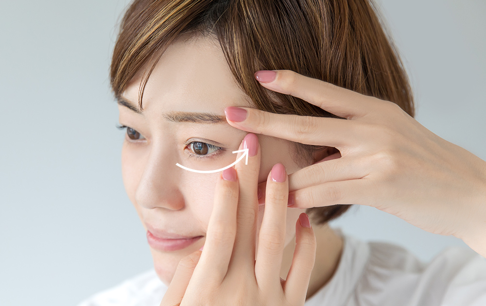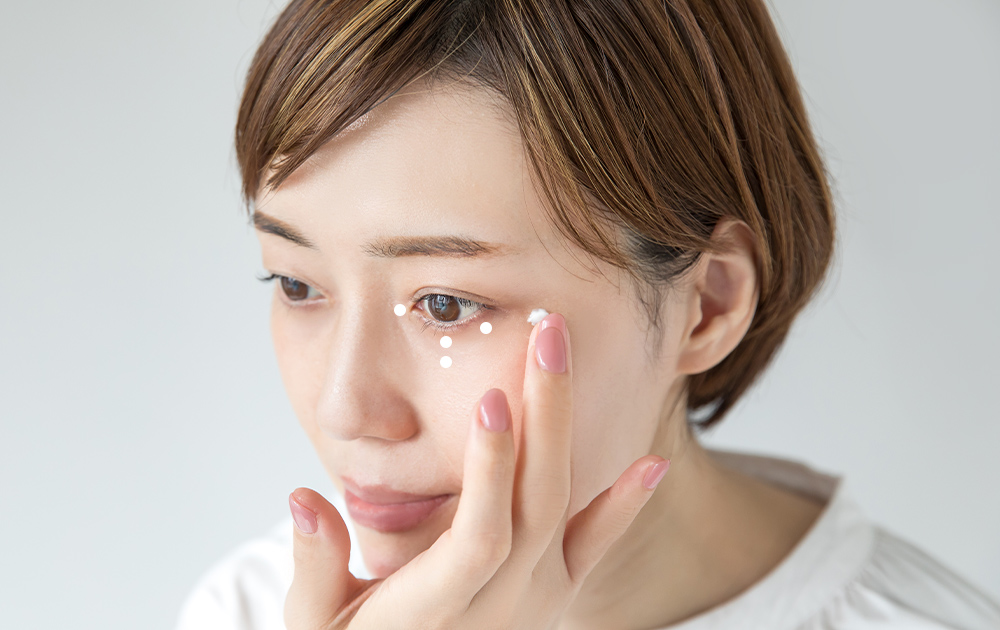 目尻を引き上げながら、薬指で目尻から目頭へ向かってクリームを点置きします。