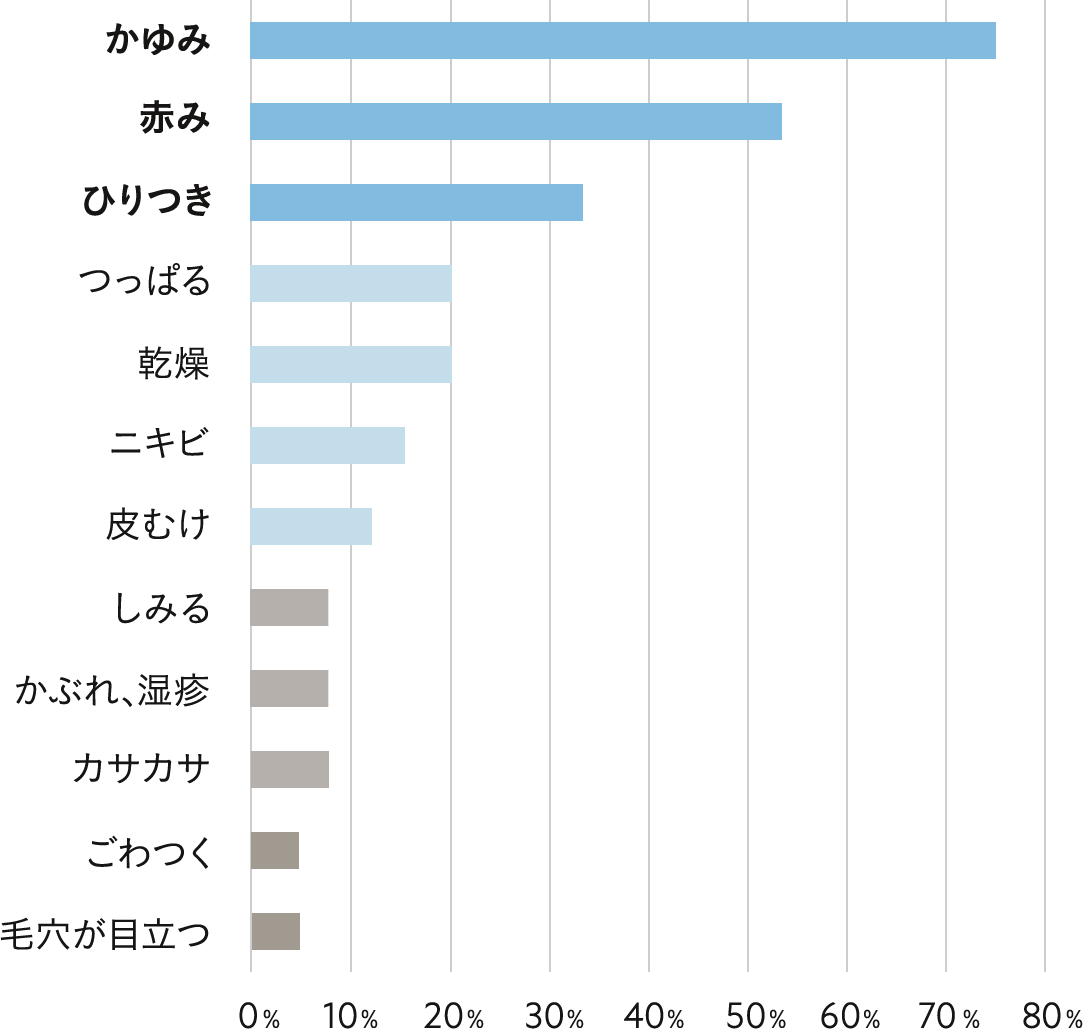 ― 8割弱の方が敏感肌になっていると感じる症状に「かゆみ」を挙げておられます。その他「赤み」が半数、「ひりつき」が3割といった結果に。