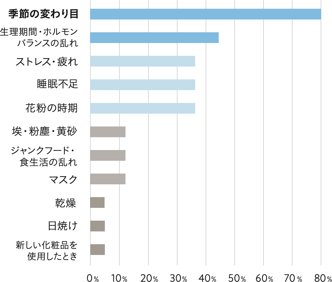 ― 8割の方が「季節の変わり目」に肌が敏感だと感じているとのこと。季節の変わり目は温度や湿度の急激な変化に伴い、肌のバリア機能が乱れやすくなるため、「敏感肌」の方は注意が必要だと言えそうです。その他にも生理中前後やストレス、睡眠不足からも肌が敏感になりやすい様子。すこやかな肌のためにも、普段から規則正しい生活を意識しましょう。