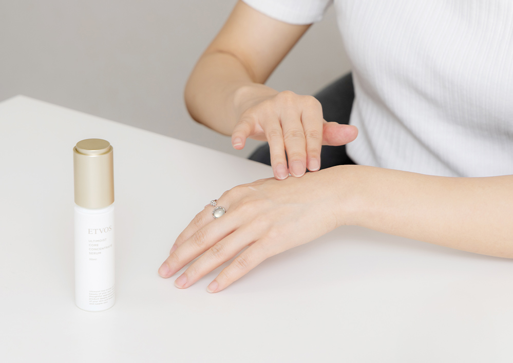 中得:「アルティモイスト コアコンセントレートセラム」を使ったほうが、肌のツヤをより感じました。あと、肌がうるおいで保護されている感覚もあって、私は「アルティモイストライン」愛用者なので、ライン使いしたいなと思いました。