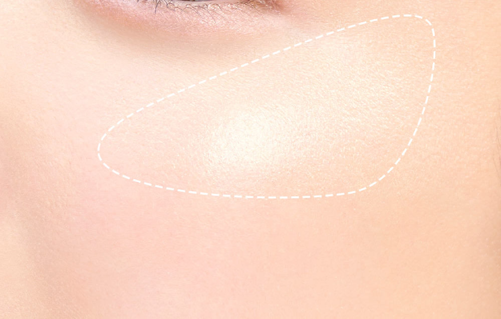 ツヤを出したい頬の高い位置やおでこ、目頭、目周りのCゾーン、鼻筋などに塗布します。