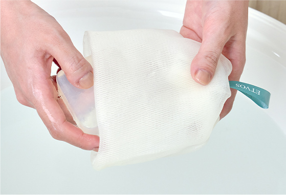 5回程度揉みます。両手でネットを包み込みしっかりと泡立て、弾力のある濃密な泡をつくります。