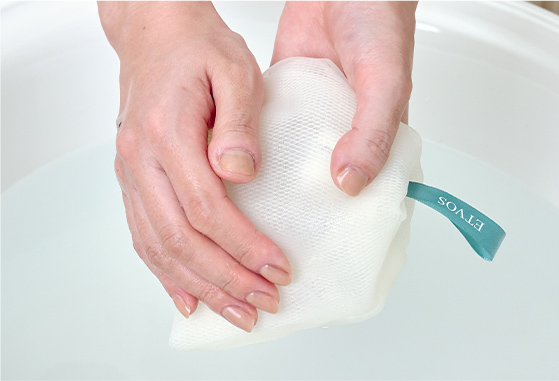 泡立てネットに軽く水分を含ませ、ネットの中に石けん(洗顔料)を入れます。