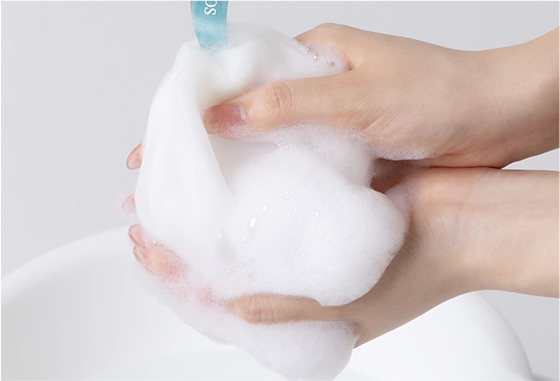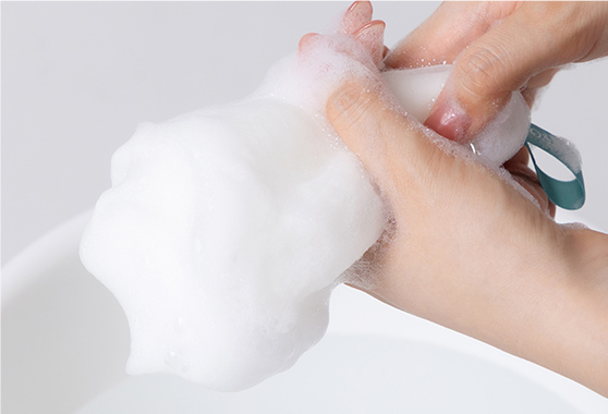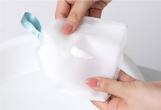 オーガンジーのやわらかな質感が心地よい泡立てネット(別売り) の使用がおすすめ!