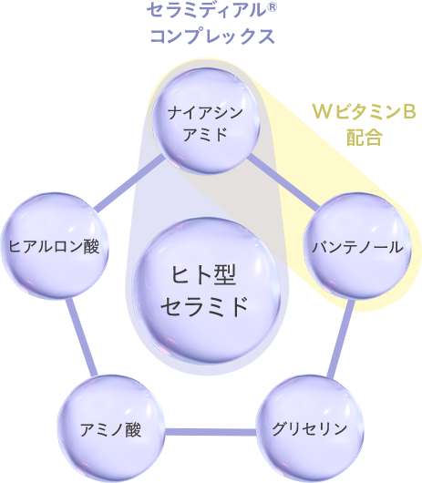 ヒト型セラミド※1、ナイアシンアミド※2から成るセラミディアル®コンプレックスのアプローチでうるおいでふっくらと満たし、ハリのあるツヤ肌へ。