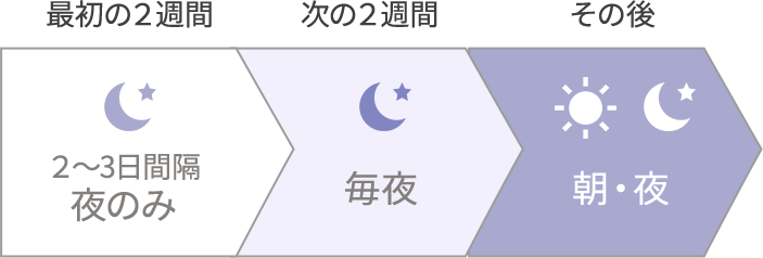 最初の2週間は2~3日間隔で夜のみ、次の2週間は毎夜と、少しずつ使用回数を増やしていくことをおすすめします。