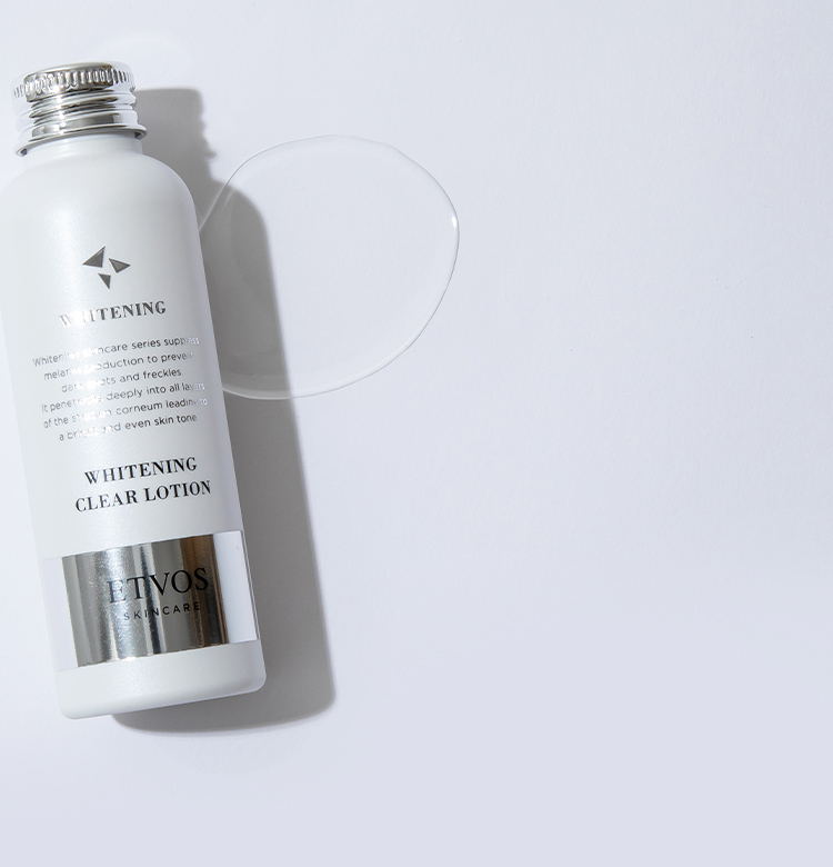 美白有効成分3-O-エチルアスコルビン酸が、メラニンの生成をおさえ、シミ・そばかすを防ぎ、保湿成分が透明感※8をサポートします。