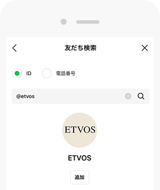 LINEアプリ内の「友だち追加」から「@etvos」でID検索して登録することもできます。