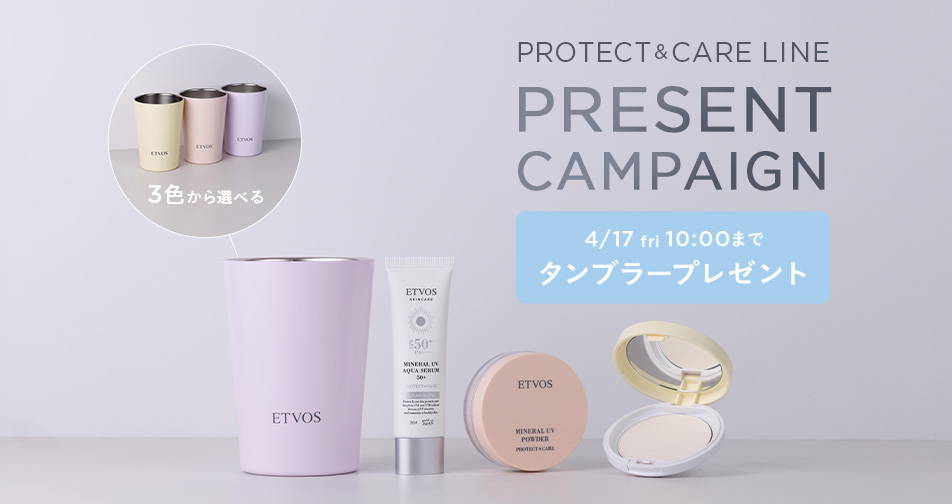 期間中、プロテクト&ケアラインを含む11,000円(税込)以上ご購入で「ETVOSオリジナルタンブラー(全3色)」をプレゼント。