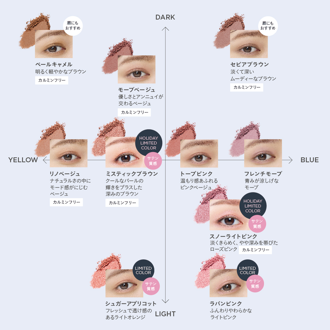 また皮脂吸着パウダー※1とくすみにくいピュアマイカ※2を配合で、化粧ヨレを防ぎ、発色の美しさをキープ。